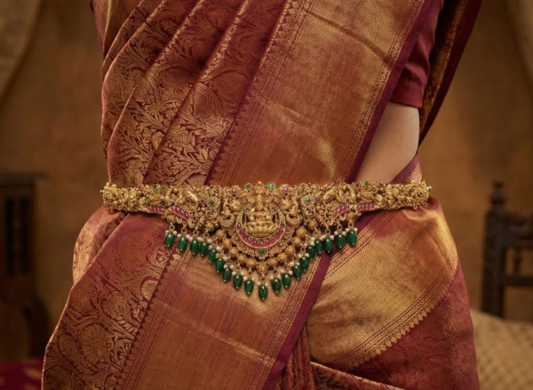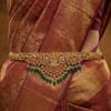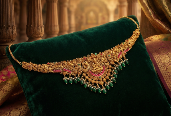 Design Details: Crafted with precision, the center of the belt features a beautiful deity figure, surrounded by intricate floral and peacock carvings typical of authentic temple jewellery. The vivid pink and green stones provide a striking contrast against the antique gold background, while the hanging green beads add a touch of feminine elegance.