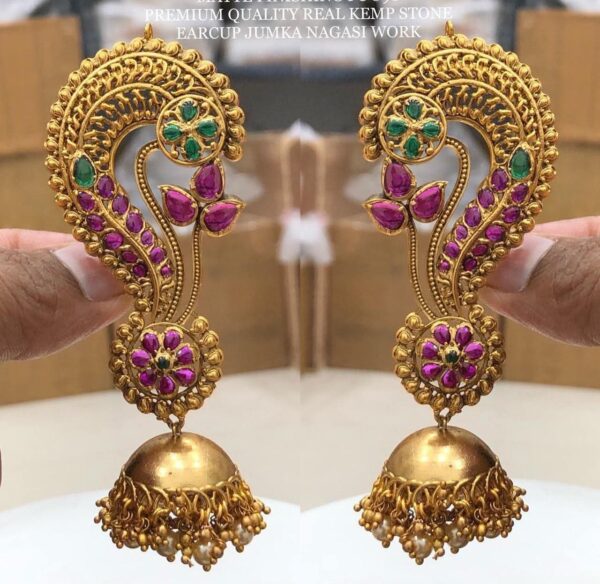 Be the first to review “Antique Gold Ear Cuff Jhumki Earrings for Women | Temple Jewelry Style with Multicolor Stones & Pearl Drops | Traditional Ethnic Wear”