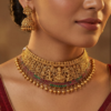 Design Details: At the heart of this choker lies the divine motif of Goddess Lakshmi, symbolizing prosperity and beauty, intricately carved and surrounded by delicate floral and peacock patterns. The necklace is embellished with high-quality pink and green stones that add a vibrant pop of color against the rich, matte gold tone. The neckline is fringed with clustered golden beads (ghungroos) that sway gracefully with every movement.