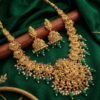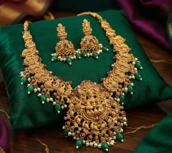 Premium Detailing To add a pop of color, the set is accented with synthetic rubies and emerald-colored beads. Small white pearls line the base of the necklace and the Jhumkas, adding a soft, feminine touch. The matching Jhumka earrings mirror the deity and peacock motifs, completing the ensemble.