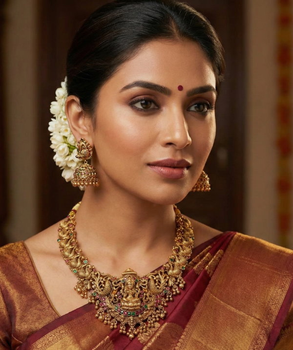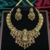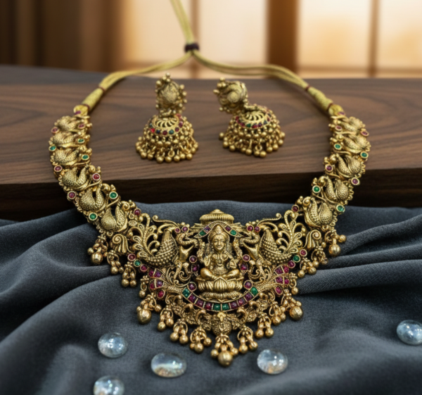 Embrace the timeless elegance of heritage craftsmanship with this Goddess Lakshmi Temple Short Necklace Set. Rooted in the rich cultural history of South Indian jewelry, this set is designed for the woman who appreciates the divine beauty of traditional motifs.