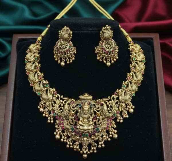 The centerpiece features a beautifully carved idol of Goddess Lakshmi seated on a lotus, signifying wealth and fortune. The necklace chain is composed of a series of intricate peacock links, each meticulously studded with premium synthetic Kemp stones in traditional festive hues. The antique matte gold plating gives the jewelry a sophisticated, non-shiny finish that mimics authentic 22k gold heirloom pieces.