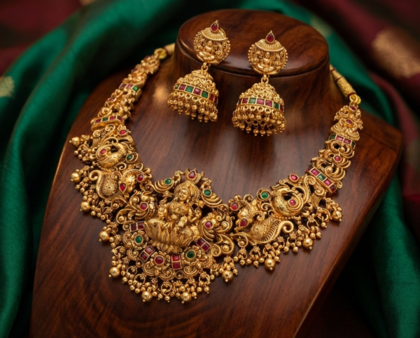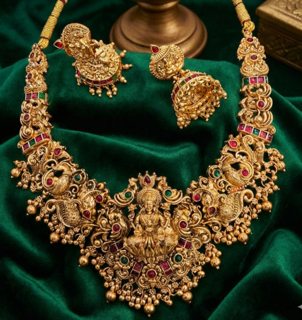 The necklace features a prominent Goddess Lakshmi pendant, intricately carved to showcase fine details, flanked by majestic peacock motifs that wrap gracefully around the neckline. Each element is meticulously studded with classic red and green stones, creating a timeless contrast against the antique gold matte finish.