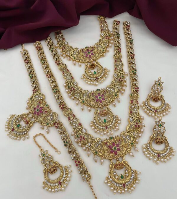 • This grand bridal jewelry combo set features a stunning three-layer necklace design, complete with matching earrings, maang tikka, and kamarpatta (waist belt). Beautifully crafted with floral motifs, pearls, and multicolor stones, this South Indian-style set brings elegance and tradition to your wedding or festive attire.