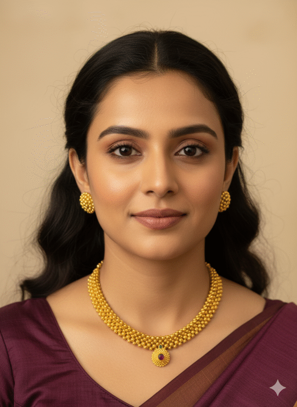 Own the timeless elegance of Marathi culture with this Classic Thushi Choker Necklace set. This piece showcases the most traditional gajra (ball/bead) style, featuring multiple closely-knit strands of high-quality gold-finish beads that hug the neck beautifully. The dense, woven pattern is a hallmark of authentic Maharashtrian jewellery. The necklace is completed with a small, elegant round pendant embellished with a central ruby/maroon stone and surrounding miniature gold beads, adding a subtle pop of color and focal interest.