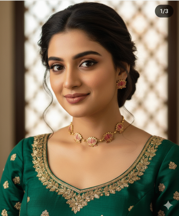 The set is completed by a pair of perfectly matching Lotus Stud Earrings, mirroring the necklace’s floral motif and enamel colors. This elegant set is ideal for festive occasions like Navratri, Diwali, or as a sophisticated accessory for parties, office events, or when paired with contemporary sarees, kurtas, or lehengas.