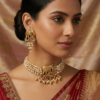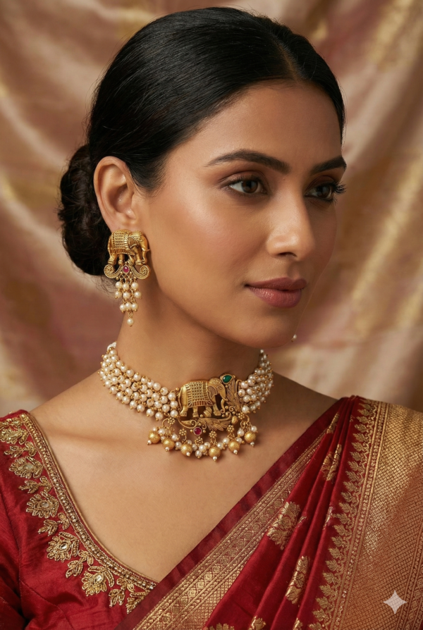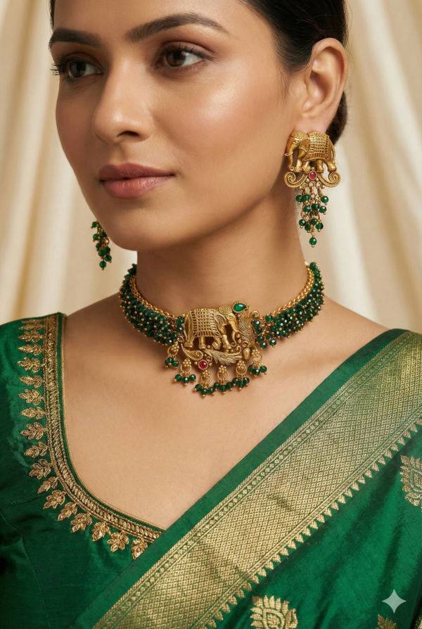 Celebrate Heritage with the Gaja Collection Make a grand entrance with this exquisitely crafted jewelry set that pays homage to traditional Indian artistry. The necklace features a majestic elephant motif centerpiece, symbolizing strength and wisdom, finished in a rich antique gold polish.