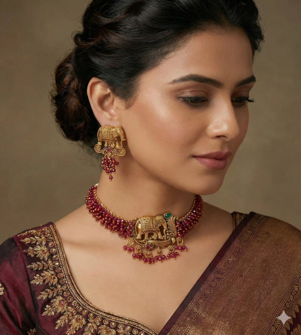 Exquisite Craftsmanship Each set is meticulously designed with layers of high-quality synthetic beads (or pearls) that sit comfortably against the neckline. The matching earrings mirror the intricate elephant design, complete with delicate bead droplets to provide a cohesive and sophisticated look.