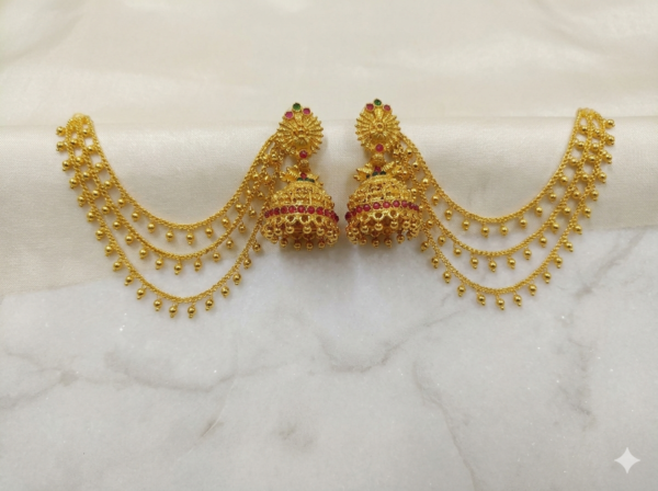 The standout feature of this set is the Triple-Layered Ear Chains (Mattal). These chains drape gracefully over the ear and pin into the hair, not only providing a majestic royal look but also helping to distribute the weight of the earrings for maximum comfort. Each chain is finished with tiny golden beads (ghungroos) that add a subtle movement and flair.