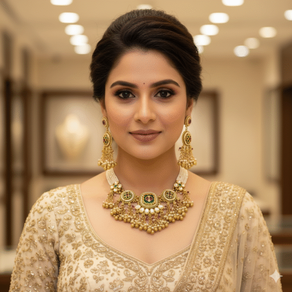 Be the first to review “Exquisite Antique Finish Gold Choker Set with Pearl Drops, Kemp Stones & Cluster Design”