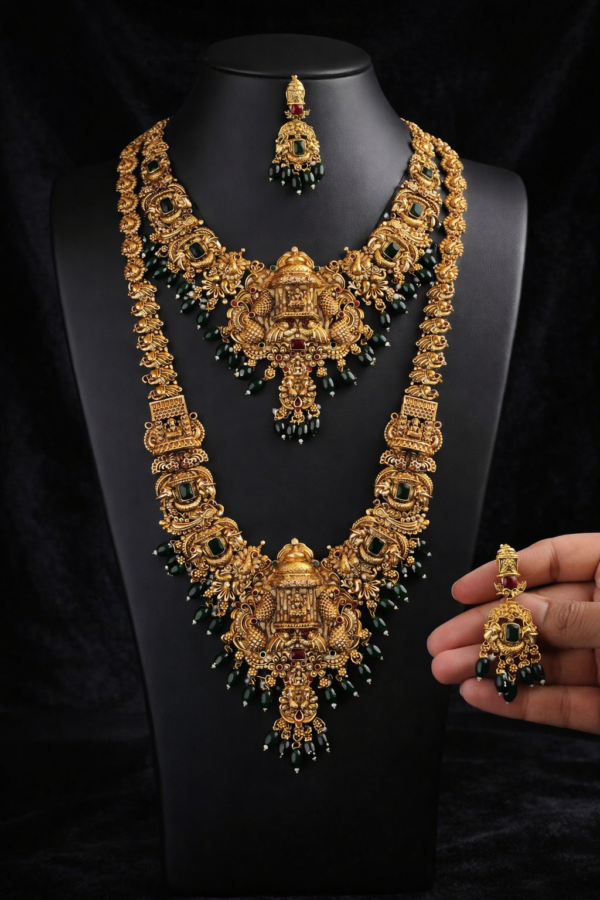 Every inch of this set is adorned with meticulous metalwork. The necklaces are accented with high-quality green onyx-style beads and deep red stones that add a pop of regal color. The centerpiece of both necklaces features a traditional gopuram-inspired pendant, symbolizing prosperity and grace.