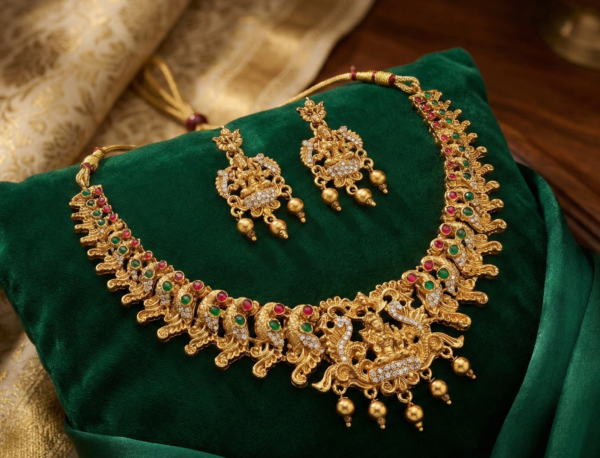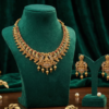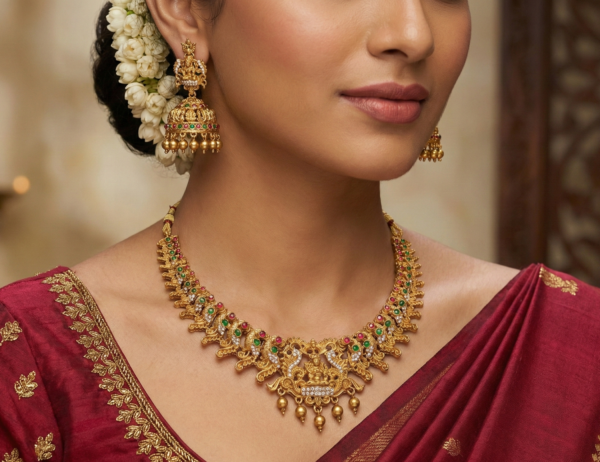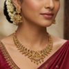 Embrace the divine elegance of Indian heritage with this Goddess Lakshmi Temple Short Necklace Set. Rooted in the rich cultural history of South Indian temple architecture, this jewelry set is more than just an accessory—it is a piece of art.