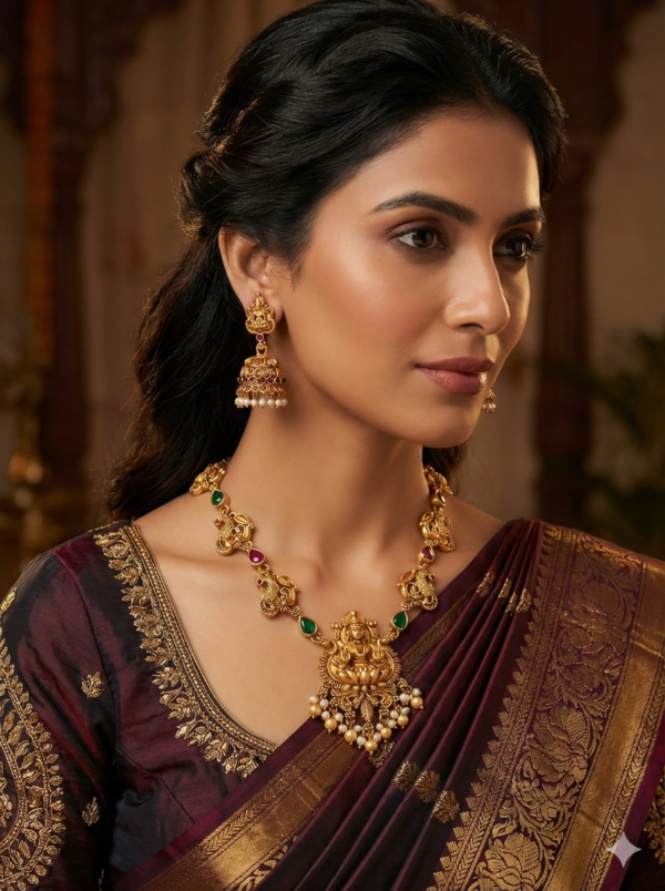 Elevate your ethnic ensemble with this breathtaking Goddess Lakshmi Temple Necklace Set. Deeply rooted in South Indian heritage, this set captures the essence of divine beauty and timeless tradition.