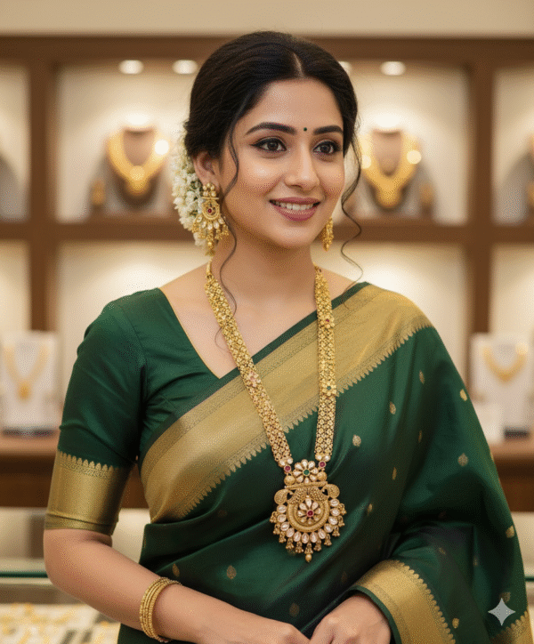 • Ideal for Traditional Wear: This haram is the perfect accessory for Kanjivaram/Kanchipuram silk sarees, Pattu Pavadai, and Lehengas. It’s an absolute essential for weddings, engagements, Vratams, and major festivals like Onam and Pongal.
