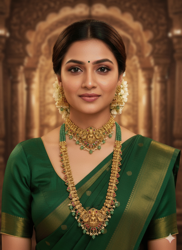 Be the first to review “Grand Bridal Temple Jewelry Combo Set: Antique Gold Choker & Long Haram with Lakshmi Pendants, Green Beads, Kemp Stones & Matching Earrings” Cancel reply