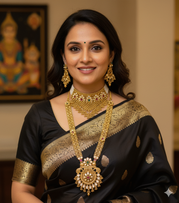 Adorn yourself with the timeless elegance of this Grand Rajwadi Combo Necklace Set. This opulent ensemble is a perfect duo, featuring a richly detailed choker and a magnificent long haram (or long chain), designed to command attention at any grand event.
