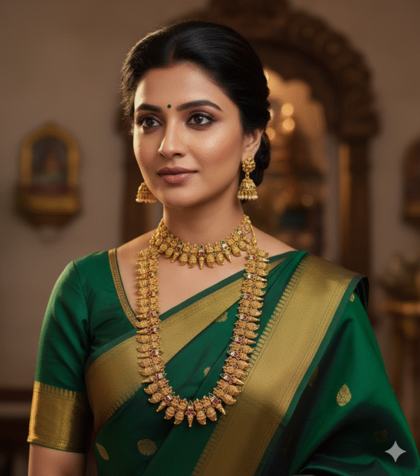 The short choker sits beautifully at the base of the neck, while the long haram gracefully drapes over the chest, creating a stunning visual impact. The set is completed by a pair of matching traditional Jhumka Earrings. This comprehensive set is essential for Bridal wear, engagements, and grand traditional festivals, pairing perfectly with Kanjivaram (Kanchipuram) silk sarees.