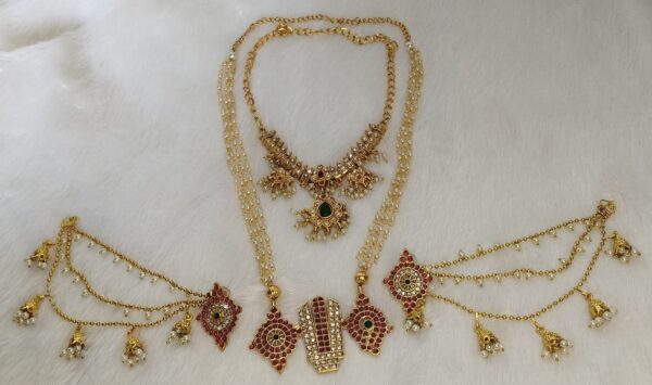 Guttapusalu Short Necklace with Shankh Chakra Namam Long Mala & Jhumka Ear/Hair Chains