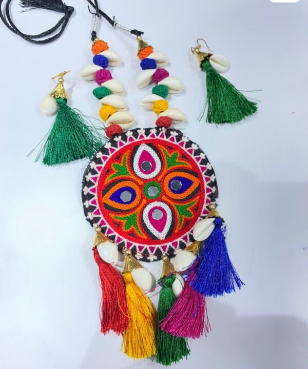 Celebrate the vibrance of Navratri with this eye-catching necklace set, adorned with colorful threads, cowrie shells, and multicolored tassels. The centerpiece features traditional embroidery in vivid hues, making it perfect for Dandiya nights and folk festivals. Comes with matching tassel earrings for a complete ethnic look.