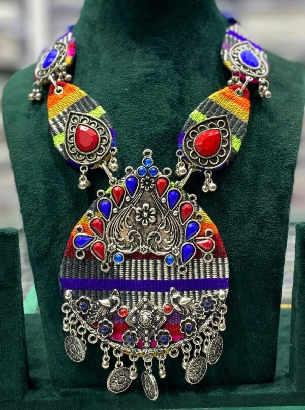 - Make a bold statement this Navratri with this eye-catching necklace that combines rich colors, traditional craftsmanship, and elegant silver detailing for a truly unique look.