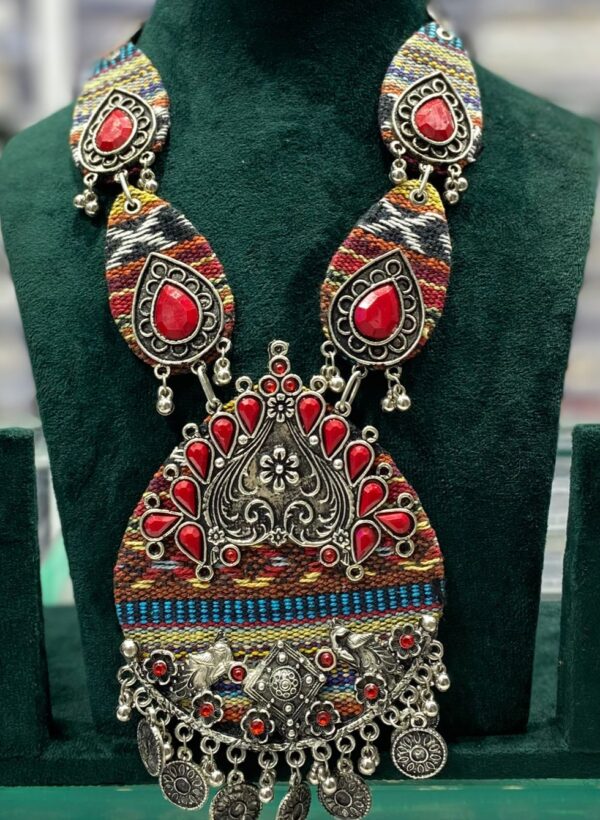 Celebrate tradition with this handcrafted oxidized silver necklace, featuring striking red stones and a beautifully detailed antique pendant. The ghungroo danglers and bird motifs add a rustic charm, while the multicolor woven base enhances the festive vibe. Perfect to pair with lehenga choli, saree, or Navratri outfits, this statement piece will add a bold ethnic touch to your festive wardrobe.