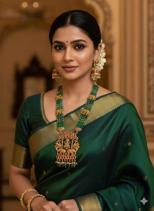 • Design: A striking long Haram crafted with bold, rich Emerald Green Beads. The chain is beautifully punctuated by Antique Gold motifs, prominently featuring majestic Elephant figures on both sides.