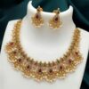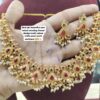 This beautiful choker necklace set is a perfect blend of traditional elegance and modern style. The necklace features a stunning array of sparkling multi-colored stones (ruby red and green) and delicate white pearls, creating a luxurious look. The floral and teardrop motifs are intricately designed, giving the set a rich, traditional feel. The antique gold finish enhances the detailed craftsmanship. The matching earrings with a similar design and pearl drops complete this gorgeous set, making it a perfect choice for weddings, parties, and festive occasions.