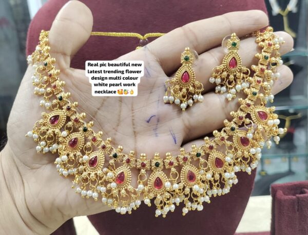 • Design: A choker-style necklace with intricate floral and teardrop patterns, accentuated with pearls and colored stones.