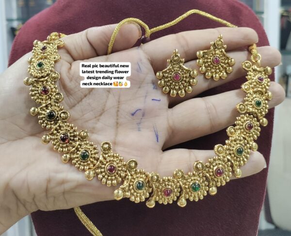 Be the first to review “Latest Trending Daily Wear Flower Design Choker Necklace Set with Multi-Color Stones and Antique Gold Finish”