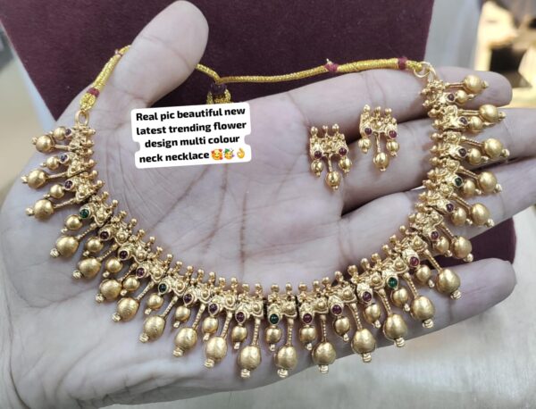 • Design: A choker-style necklace with a unique combination of floral motifs, multi-color stones, and gold beads.