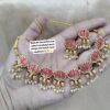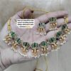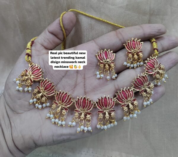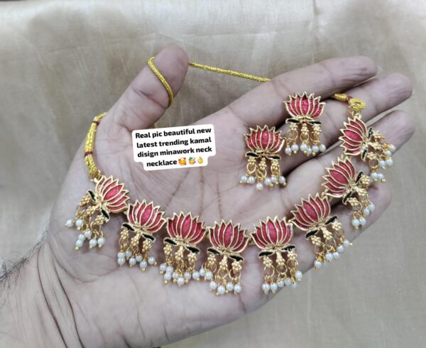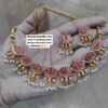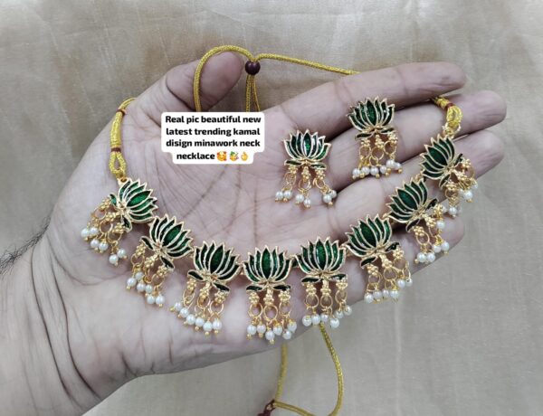 • Elegant Lotus Motif Design: Unique handcrafted choker necklace set featuring lotus-shaped charms with mina work in three stunning color variants – Pink, Green, and Pink-Green.