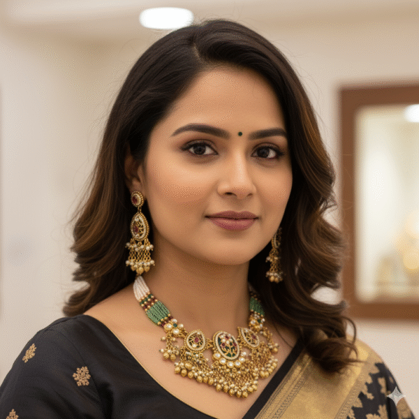 Elevate your traditional look with this Luxurious Antique Finish Gold Necklace Set. The elaborate, bib-style pendant features intricate gold artistry, detailed with rich ruby and emerald Kemp stones and Kundan-style accents. The bottom edge is lavishly adorned with clusters of pearl and gold bead drops. The neckpiece is a stunning multi-strand creation, combining classic white pearls with striking green beads for a rich aesthetic. Complete with gorgeous, matching chandelier earrings, this set captures the opulence of South Indian heritage jewelry. It’s an ideal choice for a bride, wedding guest, or any grand festive occasion.