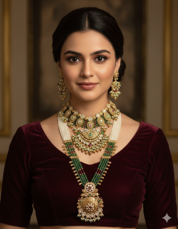 Be the first to review “Luxury Multi-Layered Pearl & Green Bead Combo Necklace Set – Antique Gold Plated Choker, Long Rani Haar and Traditional Dangler Earrings for Bridal Wear”