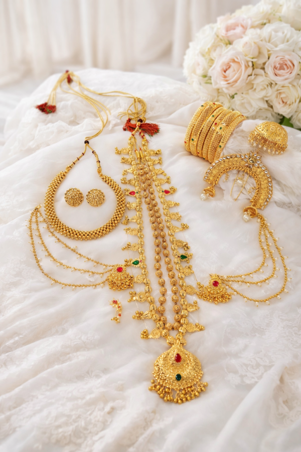 Celebrate the beauty of traditional Maharashtrian bridal jewellery with this exquisite gold-plated jewellery set designed to give a complete Marathi bride look. This luxurious set combines classic heritage design with elegant craftsmanship, making it ideal for brides and traditional occasions.