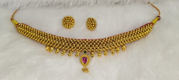 Celebrate your cultural elegance with this exquisite Maharashtrian Thushi necklace set, designed with traditional golden beadwork and a teardrop-shaped pink stone pendant. Handcrafted for a perfect ethnic touch, this choker-style necklace comes with matching round stud earrings and features an adjustable thread for comfort. Whether for a wedding, haldi, or festive celebration, this lightweight yet stunning piece completes your Marathi look effortlessly.