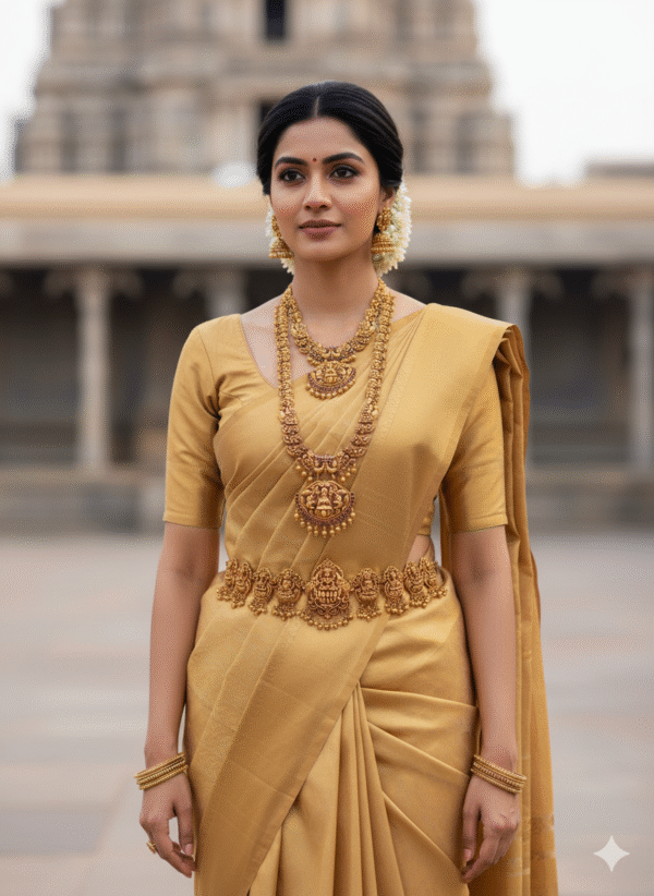 • An ornate Kamarbandh (Waist Belt), meticulously crafted with multiple Lakshmi figurines, designed to gracefully cinch the saree.