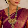 Deep emerald tones add regal charm and contrast exquisitely with the temple gold motifs, creating a bold heritage look perfect for statement sarees and ornate bridal wear.