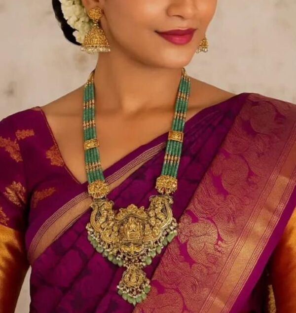 • Regal centerpiece: Matte antique-gold pendant boasting detailed goddess, elephant, and peacock motifs—rich in South Indian temple aesthetics.