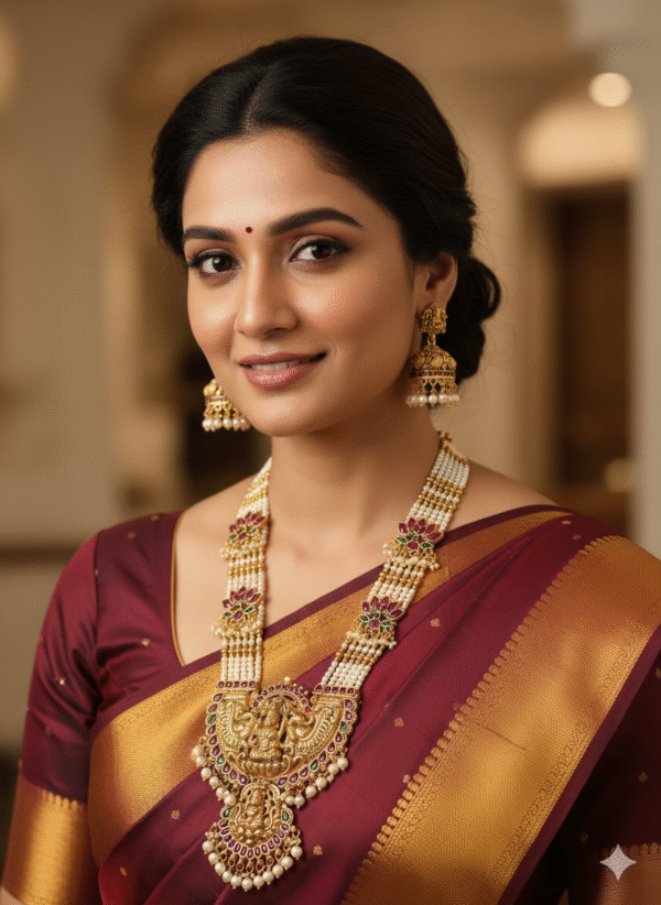 Be the first to review “Multi-Strand Pearl & Gold Plated Haram Necklace Set with Ruby Emerald Stones and Jhumkis – Classic Indian Ethnic Jewelry”