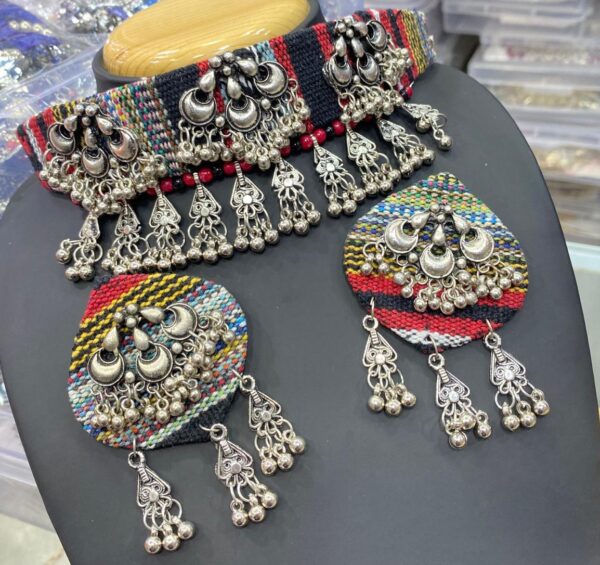 - Make a bold statement this Navratri with this eye-catching necklace that combines rich colors, traditional craftsmanship, and elegant silver detailing for a truly unique look.
