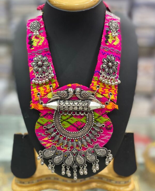 - Make a bold statement this Navratri with this eye-catching necklace that combines rich colors, traditional craftsmanship, and elegant silver detailing for a truly unique look.
