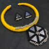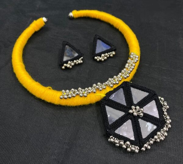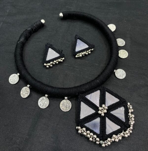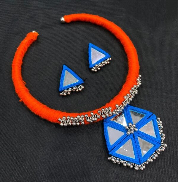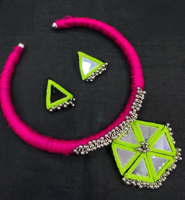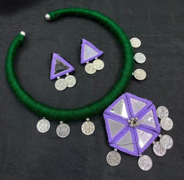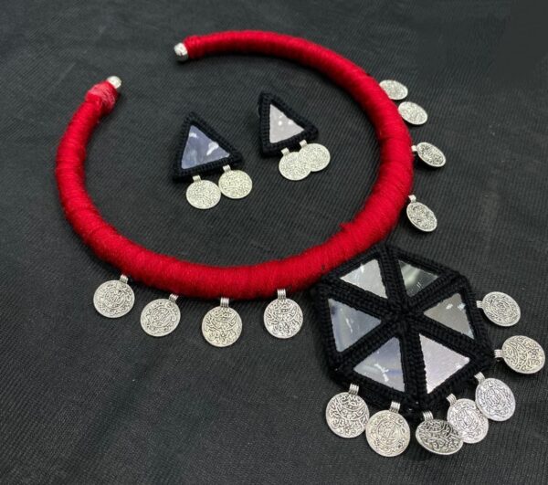 - Make a bold statement this Navratri with this eye-catching necklace that combines rich colors, traditional craftsmanship, and elegant silver detailing for a truly unique look.