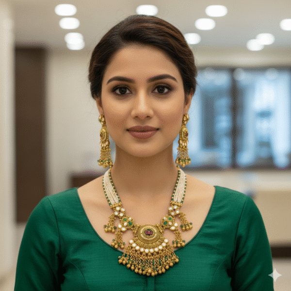 Adorn yourself with this Opulent Gold Antique Choker Necklace Set, a magnificent piece of traditional South Indian jewelry. The large, bib-style pendant features a richly detailed central disc, beautifully accented with ruby and green Kemp stones and intricate gold work. The lower edge is lavishly embellished with hanging Guttapusalu-style gold and green bead drops. The neckpiece is a stunning multi-strand creation, combining white pearls with contrasting green beads. Complete with gorgeous, matching chandelier earrings, this set is ideal for a bridal look, festivals, and grand occasions where you seek a regal and timeless presence.