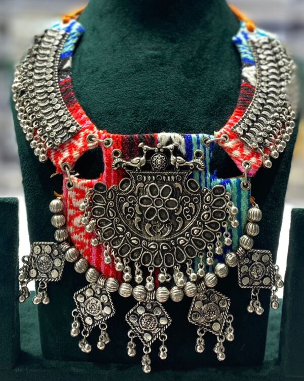 Be the first to review “Oxidized Silver Tribal Necklace with Antique Pendant & Red-Blue Thread Work – Navratri Jewellery for Women”