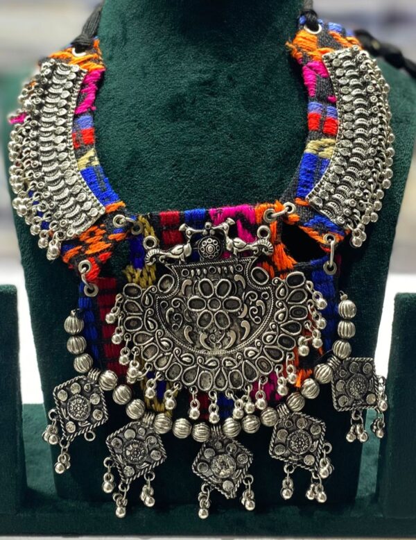 • Navratri Special Design: Traditional oxidized silver necklace with antique pendant and vibrant multicolor thread work – perfect for Garba & Dandiya nights.