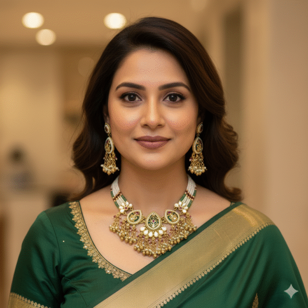 Be the first to review “Regal Gold Antique Choker Necklace Set with Emerald & Ruby Kemp Stones and Pearl Clusters”