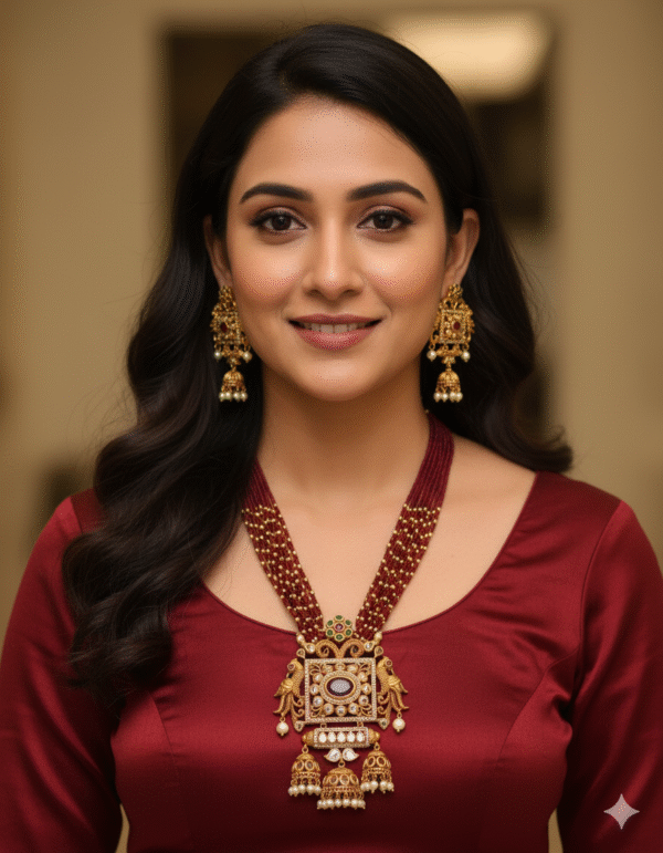 This set includes a pair of perfectly matching earrings that echo the design of the pendant, completing your look with sophistication. Ideal for weddings, festive occasions, and cultural celebrations, this vibrant red necklace set is sure to turn heads and add a majestic touch to your ethnic ensemble.
