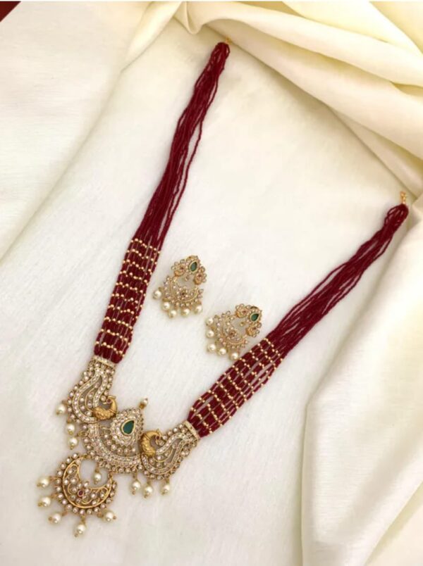 Add a regal charm to your ethnic look with this Royal Beaded Mala Necklace Set. Featuring multiple strands of deep maroon beads with golden accents, the necklace is highlighted by a grand peacock motif pendant, beautifully adorned with CZ stones, green gems, and elegant pearl drops. Matching statement earrings complete the set, making it an ideal choice for weddings, festivals, and cultural celebrations.
