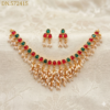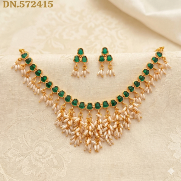 Add timeless South Indian elegance to your jewellery collection with this beautifully crafted Kemp Stone Pearl Drop Necklace Set. Inspired by traditional temple jewellery designs, this necklace features a stunning row of vibrant kemp stones set in rich gold polish, enhanced with delicate pearl bead danglers that create graceful movement and royal charm.
