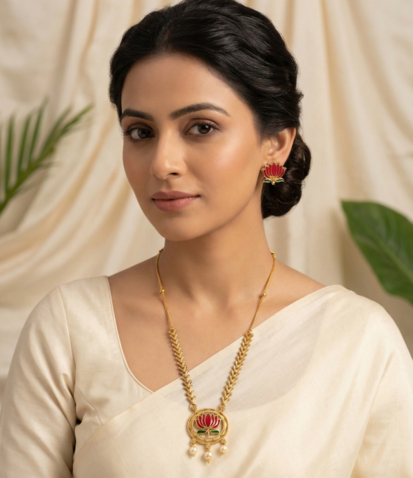 The set includes matching lotus stud earrings that perfectly complement the necklace design, creating a complete traditional jewellery look. The rich gold polish finish gives the jewellery a luxurious appearance similar to real gold while remaining lightweight and comfortable to wear.